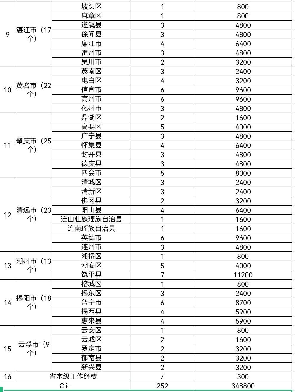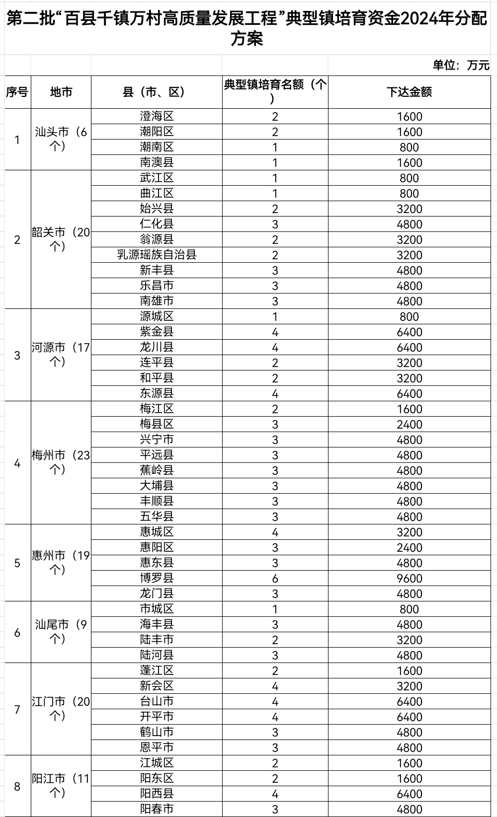 你的家乡在内部吗?给它点个赞(可多选) 汕头市6个镇,共5600万元 韶关市20个镇,共30400万元 河源市17个镇,共26400万元 梅州市23个镇,共32800万元 惠州市19个镇,共24800万元 汕尾市9个镇,共13600万元 江门市20个镇,共27200万元 阳江市11个镇,共14400万元 湛江市17个镇,共25600万元 茂名市22个镇,共29600万元 肇庆市25个镇,共34400万元 清远市23个镇,共32000万元 潮州市13个镇,共16000万元 揭阳市18个镇,共23700万元 云浮市9个镇,共12000万元 提交