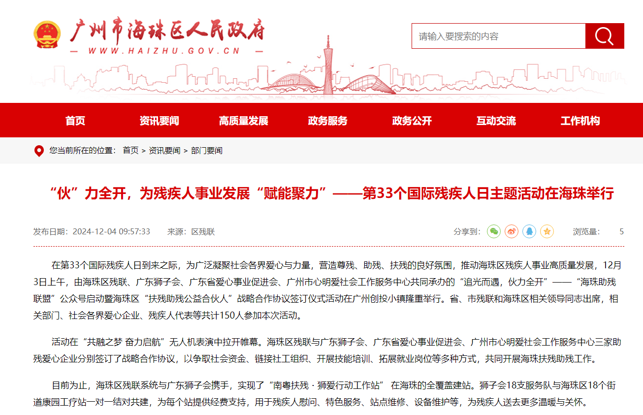当今贬抑,海珠区残连络统与广东狮子会联袂,杀青了“南粤扶残・狮爱步履使命站” 在海珠的全袒护建站。狮子会18支服务队与海珠区18个街谈康园工疗站一双一结对共建,为每个站提供经费辅助,用于残疾东谈主慰问、特点服务、站点维修、拓荒惊叹等,为残疾东谈主送去更多和顺与情切。