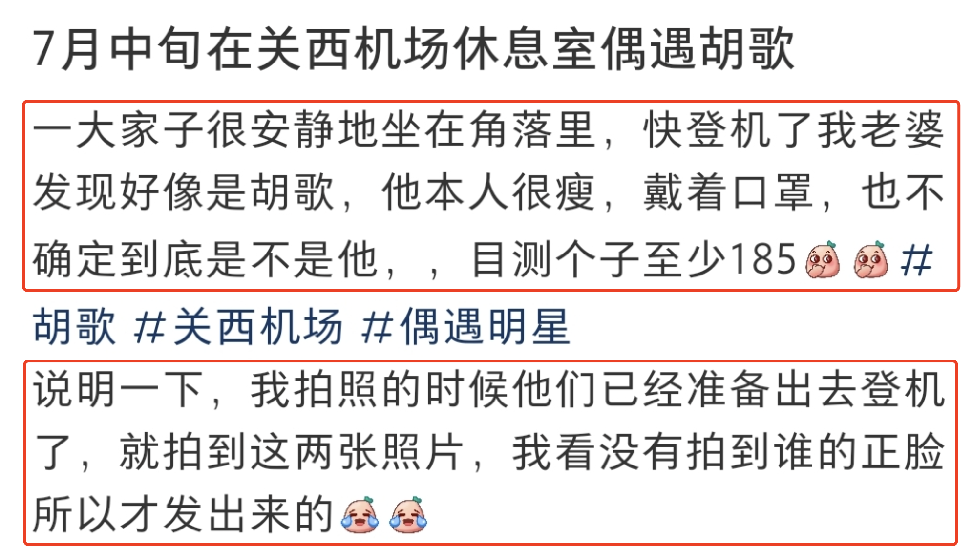 8月2日,有博主晒出了偶遇胡歌的相片,偶遇的技能是七月中旬,偶遇的场地是日本的关西机场。