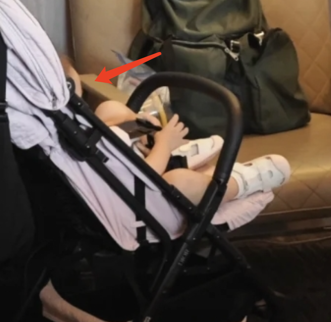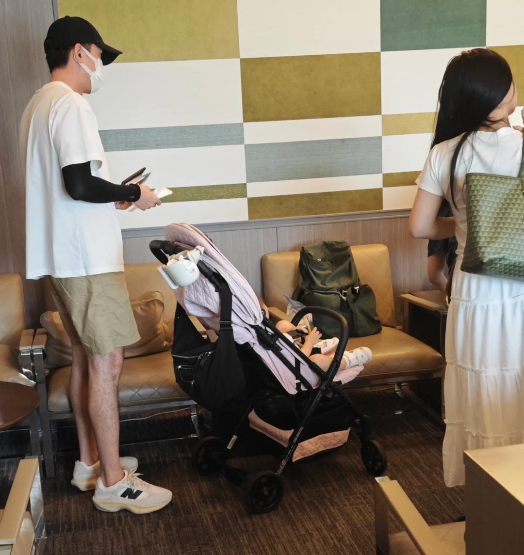 另一张相片中,小茉莉坐在婴儿车里,胡歌站在车旁,似乎是准备推着男儿登机离开了。