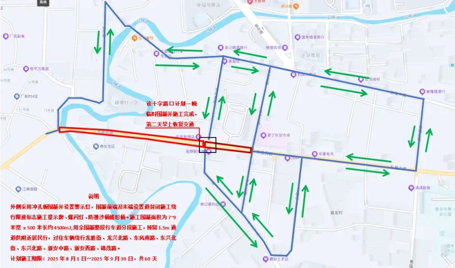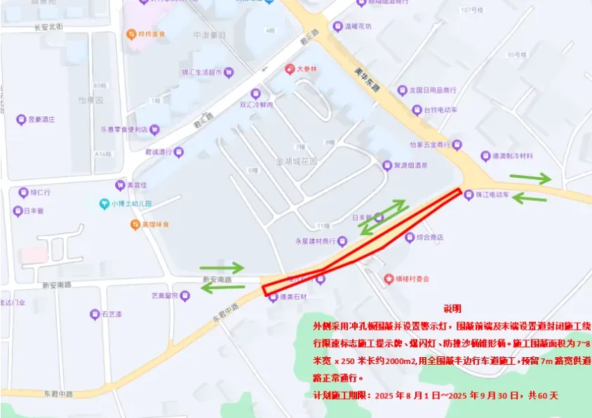 东君中路(新安东路老友意思华东路段)右幅路面全闭塞施工。闭塞时分为2025年8月8日至2025年9月30日全天,共53天。闭塞施工手艺,过往车辆于左幅有序交叉行驶。
