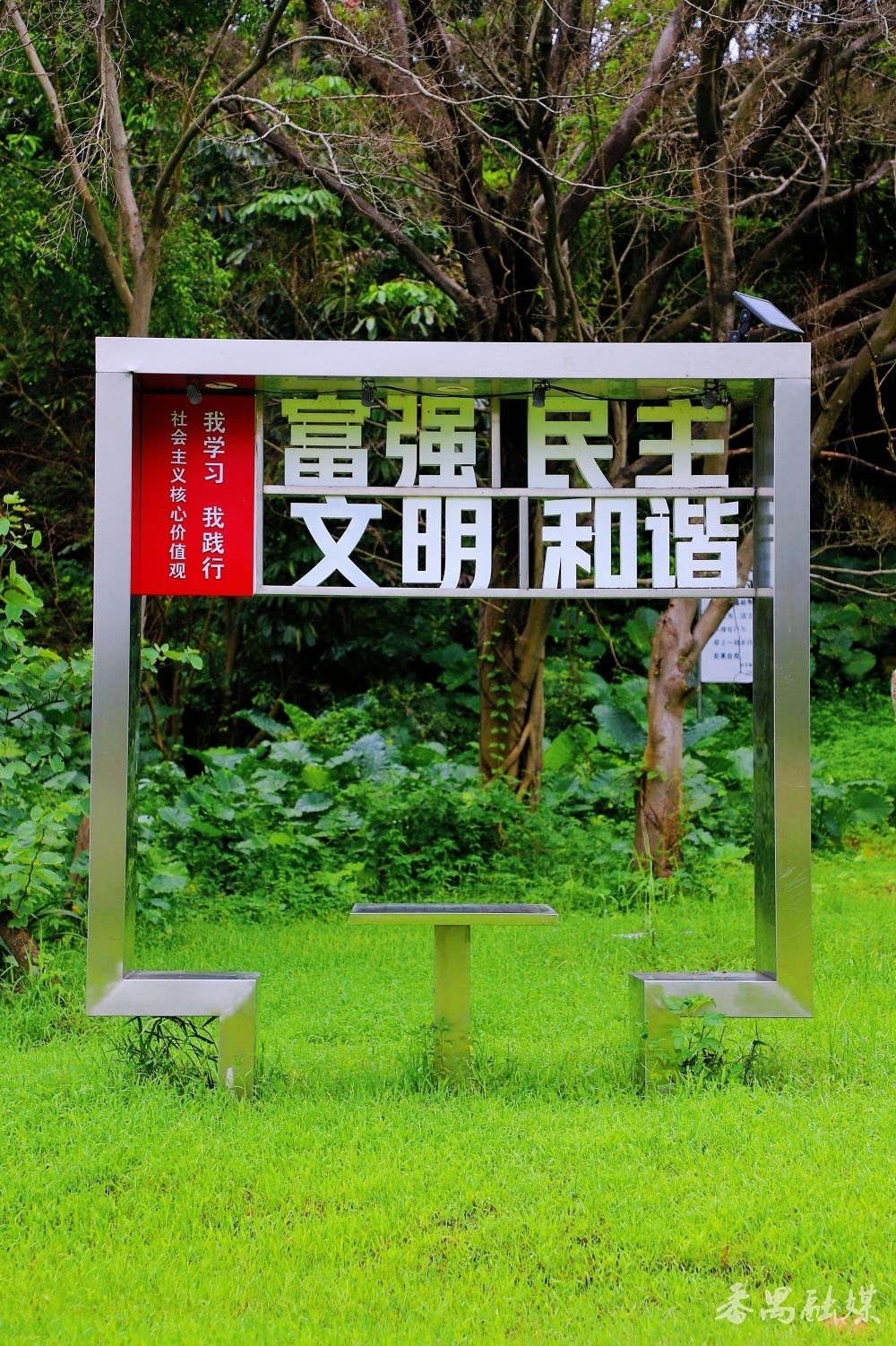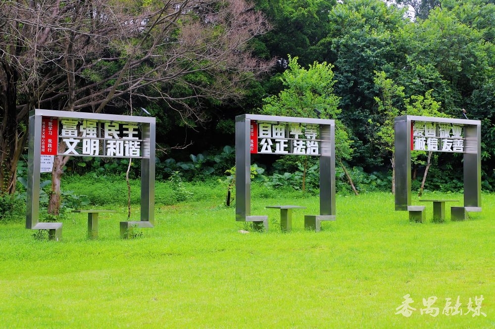 再往前点,湖边草地上的三套桌椅极为终点。“富强民主时髦和谐”等字眼吊挂在桌椅上方,将社会成见中枢价值不雅当然地融入休憩要领和生态空间。坐下来时,望着水光潋滟的湖面,对价值不雅的剖判仿佛在好意思景的烘托下愈加无邪具体。桌面上的中国象棋棋盘更是自然的酬酢场,无论老小,都不错带上象棋切磋一二,传统文化就这样混着青草香钻进心里。