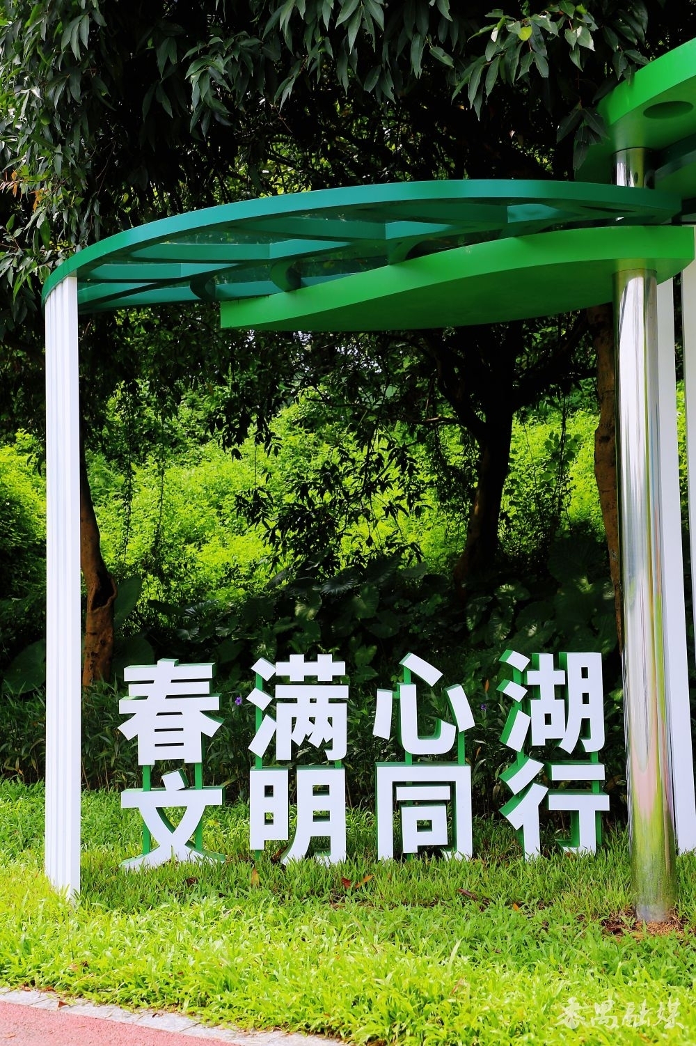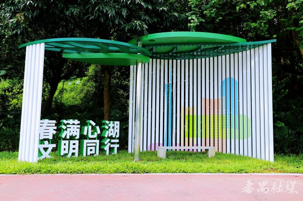 沿湖畔小径继续前行,远远就望见一派“绿叶”撑起的空间,走近才知是“春满心湖”休息驿站。驿站造型簇新当然,多半白色的小方柱托起舒展的绿叶顶,阳光从叶片间漏下来,在大地拼接出光影。雨天来躲雨,好天来歇脚,在“绿叶”之下,感受清风拂面,凝听鸟鸣湖语,困顿顿消,心旷神怡。