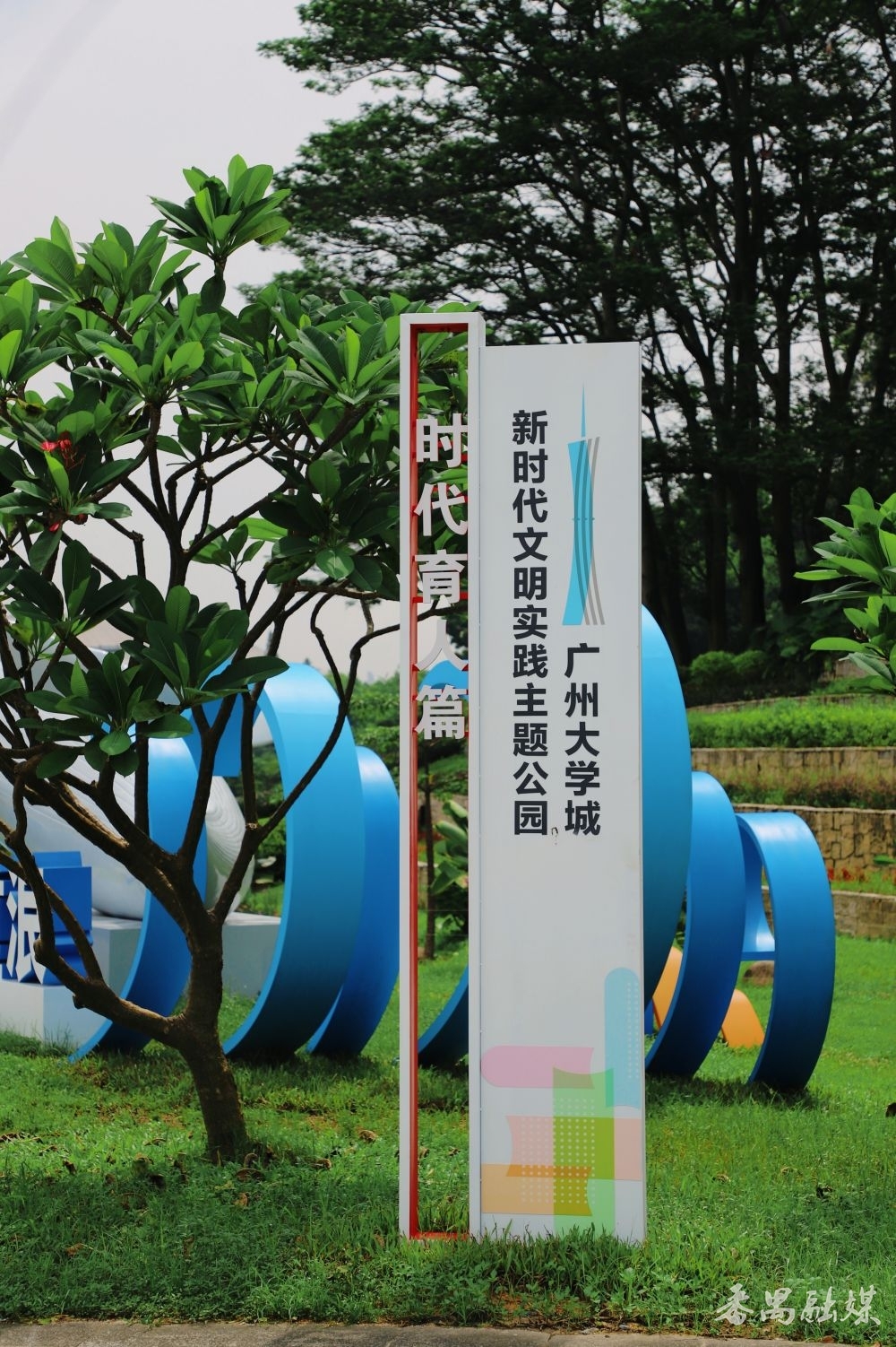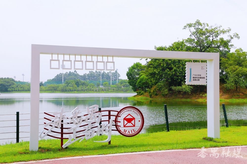 甫一入园,以蓝色为主色彩的“广州大学城新期间时髦实檀越题公园”进口标志字便撞入眼帘。字体底座藏着谨防想——“东谈主字形”竹帛托举着笔墨,暗合“以东谈主为本”理念和广州大学城的育东谈主初心;息争勾画的岭南屋檐弧度,又把番禺的古早挂念轻轻叠进当代工艺里。站在标志前,像是翻开了一册会呼吸的书,幽幽的墨香穿越古今氤氲萦绕,久久不散。