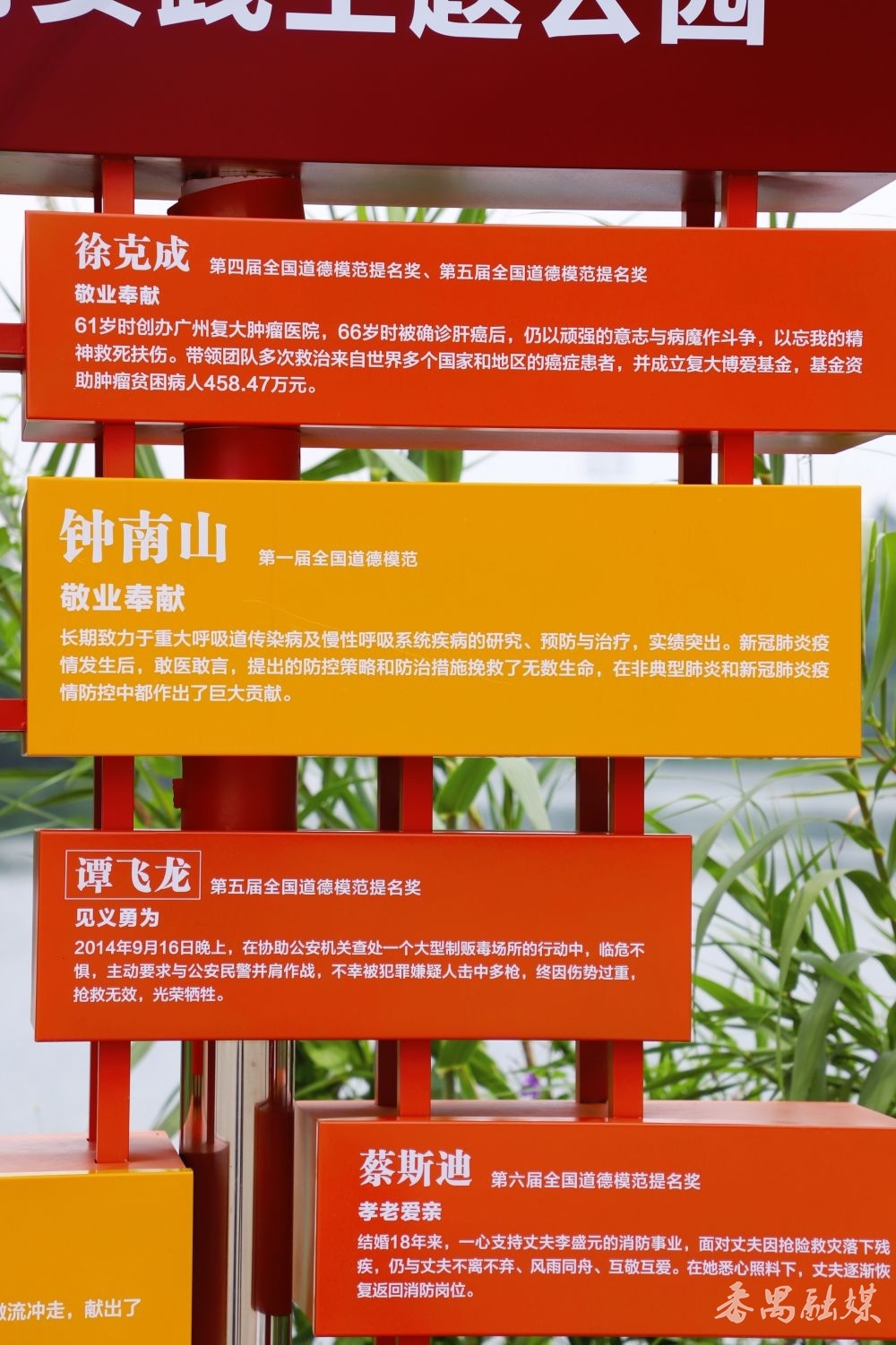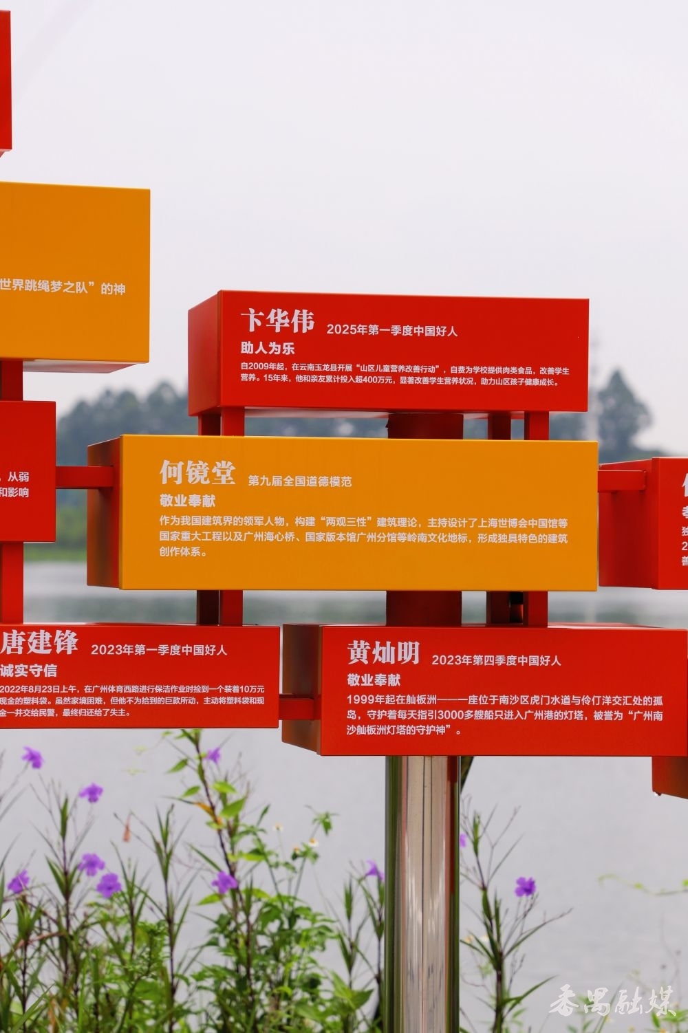 沿着广场走到湖边,不错看到“微光成炬 德耀羊城”主题景不雅。科技感满满的火把造型里,藏着最动东谈主的温度。每片“火苗”上,都记载着“世界谈德门径”“世界谈德门径提名奖”“中国好东谈主”等奖项得回者的感东谈主故事。钟南山、赵广军、何镜堂……一个个光点在矩阵里汇聚。正本时髦从不是驴年马月的灯塔,而是多半普通东谈主举起的萤火,聚在一齐就照亮了整座城。