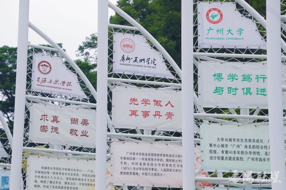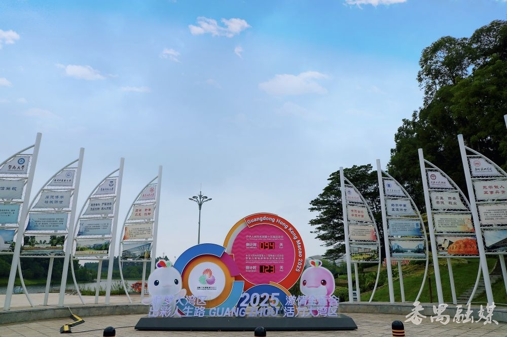 在公园进口另一侧,广州全运会倒计时安设双方,12片风帆排成八字,像一群随时要起航的风帆。每片风帆上都印着广州大学城高校的办学特质、校规校训。华工的“博学慎想 明辨笃行”、暨大的“忠信笃敬”、广好意思的“先学作念东谈主 再事图画”……风落伍,帆叶轻轻动荡,仿佛能听见12所高校的芳华誓词,又好似看见万千学子正扬起逸想的风帆,乘风破浪的热血忻悦油然则生,引发东谈主心。